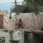 Die Movieland Studios, sind Teil des Canevaworld Resort, welches neben den Freizeitpark auch aus einen Outdoor Wasserpark (Caneva Aquapark) und mehreren Themenrestaurants besteht. Am Italienischen Gardasee gelegen sind die Movieland Studios in direkter Nachbarschaft zu Italiens größtem Freizeitpark, dem Gardaland, zu finden. Seit 2003 behauptet sich der kleine Filmpark, der schon mehrfach finanziell von der Schließung bedroht war, mit ungewöhnlichen und zum Teil in Europa einmaligen Attraktionen, gegen die übermächtige Konkurrenz des „Gardalands“. Begeben wir uns also auf einen Rundgang durch diesen kleinen, aber liebenswert charmanten Filmpark. Am Eingang finden wir die Kassen nicht etwa in schlichten Containern oder dergleichen, nein, denn alte Doppeldeckerbusse dienen hier als Kassenhäuschen. Das ist schon mal eine nette Idee wie ich finde. Hinter dem Eingangstor begrüßen uns dann auch gleich verschiedene Filmcharaktere, wie Lara Croft oder die Blues Brothers, so dass gleich Hollywood-Feeling aufkommt. Morgens zur Parköffnung und dann noch einmal Abends vor Parkschluß, kann man so mehrere Filmfiguren erleben,und natürlich sich mit Ihnen fotografieren lassen. Apropos Lara Croft: Mit der „Tomb Raider Machine“ haben wir gleich die erste Thrillattraktion am Eingang. Hierbei handelt es sich um eine Abwandlung des klassischen Top Spins, den man vielfach von Kirmes und Freizeitparks her kennt. Das besondere hierbei ist, dass ein Seitenarm abknicken kann, womit eine Querneigung der Gondel erzielt wird. Hinzu kommen noch verschiedene Wassereffekte. Fünf verschiedene Nässegrade stehen dem Operator dabei zur Auswahl, was an heißen Sommertagen zu einer „gewollten“ Abkühlung der Fahrgäste führt. Gegenüber von „Tomb Raider“ befindet sich mit „The Horror House“ ein Ganzjahres-Maze der Extraklasse. Allein die Größe ist hierbei schon beeindruckend. In kleinen Gruppen macht man sich auf durch die endlos erscheinenden Gänge und Räume, die an unterschiedliche Horrorfilme erinnern sollen und das sogar auf mehreren Etagen. Dabei können immer wieder mal Live Erschrecker auftauchen, der meiste Horror ist aber mehr subtiler Natur. Extremen Splatter findet man somit nicht, das ist aber auch nicht nötig. Um sich dann sein schaurig gruseliges Erlebnis erinnern zu können, besteht auch die Möglichkeit ein „OnRide“, hier eher „OnWalk“ Foto zu erwerben, welches in einen der größeren Räume erstellt wird, wo dazu auch noch ein Live Erschrecker auftaucht. Alles in allem eine sehr gelungene Attraktion, die zu den besten ihrer Art weltweit zählt. Auf der Rückseite des Maze Gebäudes liegt, etwas versteckt, der Eingang zum „Police Academy“-Simulator. Hier gibt es ein Wiedersehen mit den Chaoten Mahoney, Jones und Co. Kernstück der Attraktion ist eine Halle mit zwei großen Leinwänden, vor denen mehrere, als Polizeiautos thematisierte Simulatoren stehen. 4 Personen finden pro Simulator Platz. Man ist hautnah dabei, wenn die Kadetten lernen sollen, wie man eine Autoverfolgung durchführt. Nachdem man während einer ersten Filmsequenz in den Simulatoren ordentlich durchgeschüttelt wurde, übernehmen die Chaos Kadetten das Kommando der Steuerung und treiben mit den Besuchern ihre Späße. Eine nett gemachte Familienattraktion, die vor allen von der Comedy lebt. Die Simulatoren für sich sind nicht sehr komfortabel und haben somit auch kein besonders tolles Fahrgefühl. Wenn wir uns jetzt zurück zur Main Street begeben und dabei vorbei an Shops und „Movieland Cars Route 66“ gehen, wo vor allen Kinder Ihre Fahrkünste auf den Miniatur-Highways testen können, kommen wir zum „The Hollywood Action Tower“. Dies ist ein Free Fall Tower der ersten Generation, so wie er heutzutage kaum noch zu finden ist und in Europa sogar einmalig ist. Mit bis zu 4 Personen sitzt man in einer Gondel, die so ähnlich wie in einen Fahrstuhl auf 40 Meter Höhe befördert wird. Dort angekommen bewegt man sich vorwärts auf das Namensschild der Attraktion zu. Ein kurzes verweilen, etwas Rauch, dann verrutschen ein paar Buchstaben des Schilds und es geht in die Tiefe. Vom senkrechten Fall führt die Schiene in die Waagerechte, so dass die Fahrgäste auf den Rücken liegend gebremst werden. Die Gondel wird dann, während diese von der oberen Schiene auf die darunter liegende geklappt wird, wieder aufgerichtet und die Fahrgäste fahren rückwärts zurück in die Station. Ein aus heutiger Sicht außergewöhnlicher Free Fall Tower, der allerdings auch mit einem recht ruppigen Fahrgefühl daherkommt. Mit "Magma 2" erwartet den Besucher eine Studio Tour der etwas anderen Art. Hier bleibt kein Auge trocken; im wahrsten Sinne des Wortes. Auf der Ladefläche eines LKW nimmt man Platz und begibt sich auf eine wilde Fahrt durch allerlei Katastrophen-Szenarios. Dabei sollte man sich gut festhalten, denn Sicherheitsgurte sucht man hier vergebens. Neben Rauch- und Feuereffekten die einen auf der Fahrt begleiten, sind es vor allem die Massen von Wasser, die an mehreren Stellen der Fahrt auf die Gäste schwappen können, aber auch an heißen Tagen für die nötige Abkühlung sorgen. Das Entleeren eines Tanklasters und das Zurückrollen des LKWs in ein Wasserbecken seinen an dieser Stelle beispielhaft erwähnt. Auf jeden Fall ein Heidenspaß! Trockener, aber ebenfalls actionreich kommt „Terminator 2: 5D Game“ daher. In dieser Interaktiven Effekt-Show muss man, mit 3D Brille und Laser Pistole ausgerüstet, so viele Terminator wie möglich abschießen. Diese tauchen dabei nicht nur auf der 3D Leinwand auf sondern auch ganz real in der Show Halle. Dabei kommen auch jede Menge Feuereffekte und einiges mehr zum Einsatz. Wieder etwas Einzigartiges in Europa. Vorbei an der „Zorro“-Show, ein Mantel und Degen Spektakel mit Comedy und Akrobatik für die ganze Familie und verschiedenen Filmkulissen, geht es zur „John Rambo Stunt Show“. Diese kann man zu einer der besten Stunt Shows Europas zähl